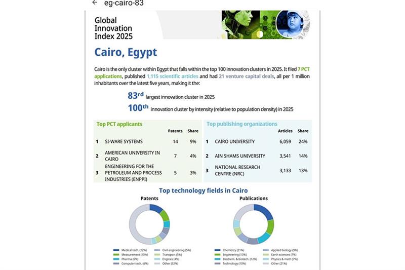 Cairo has secured a place among the world’s top 100 innovation clusters for the first time, rising 12 spots to 83rd in the Global Innovation Index (GII) 2025, published by the United Nations’ (UN) World Intellectual Property Organization (WIPO).