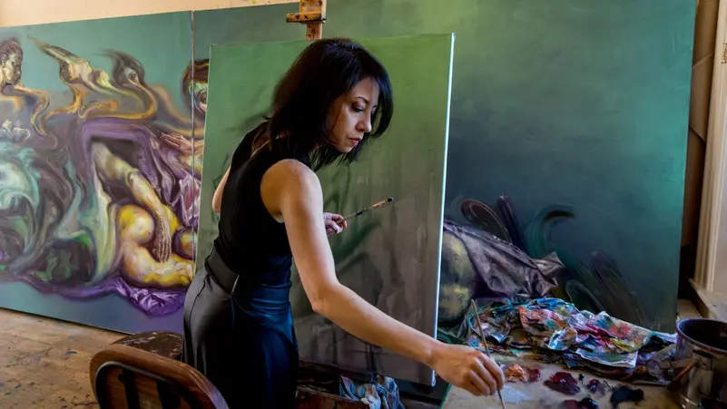 Sara Shamma is shaped by the Syrian conflict. Working from life and photographic references, she uses oil paint to achieve hyper-realism, incorporating transparent lines and movement to convey distance and an expansive emptiness. (Supplied)