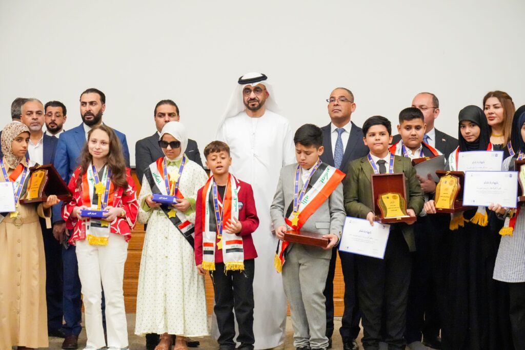 At the UAE Embassy in Baghdad, Dr. Fawzan Al Khalidi, Director of Programs and Initiatives at the Mohammed bin Rashid Al Maktoum Global Initiatives Foundation, participated, along with a number of officials and educators in charge of the Arab Reading Challenge initiative, and a large crowd of parents of the participating students.